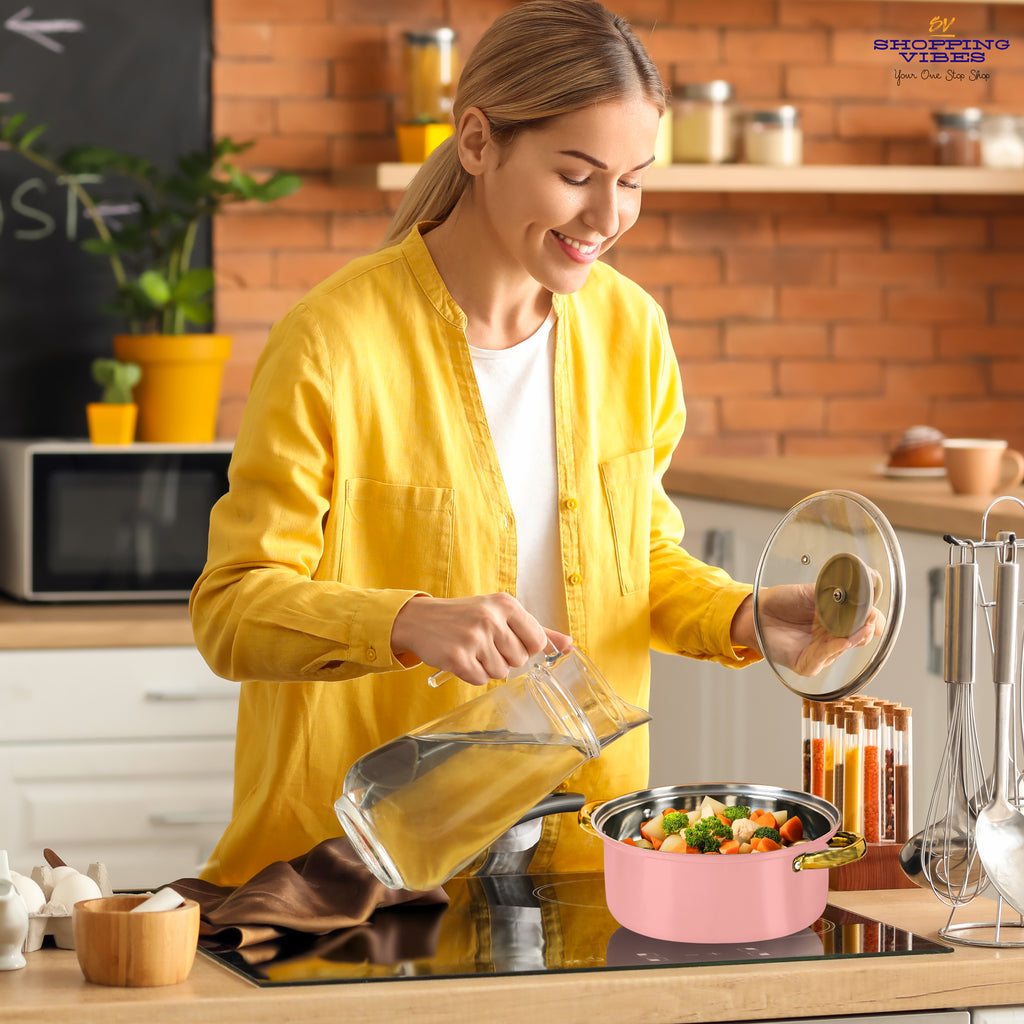 - STYLE THAT DEMANDS ATTENTION – Ditch the boring, basic pans and elevate your kitchen’s vibe! With three show-stopping colors—turquoise Blue, Vibrant Red, and Soft Pink—this set is designed to be more than cookware; it’s the crown jewel of your kitchen. ADD TO CART NOW and watch your kitchen go from ordinary to extraordinary!