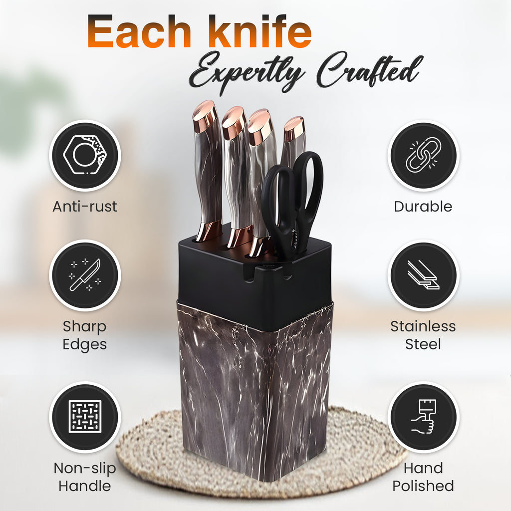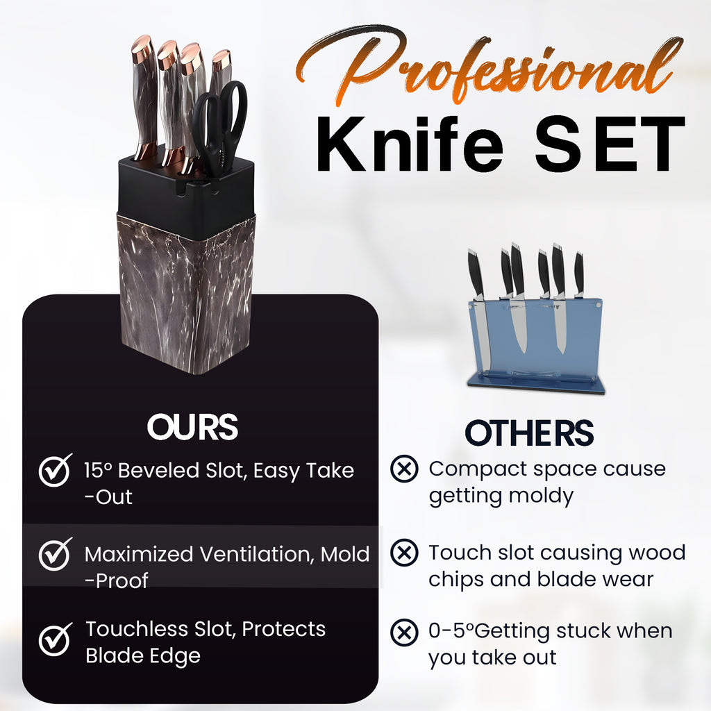 - An All-in-One Set with a Touch of Luxury— Keep your kitchen clean and organized with our stylish knife holder, featuring a dedicated slot for each knife and scissors. No more cluttered drawers or searching for the right tool—everything you need is right at your fingertips.