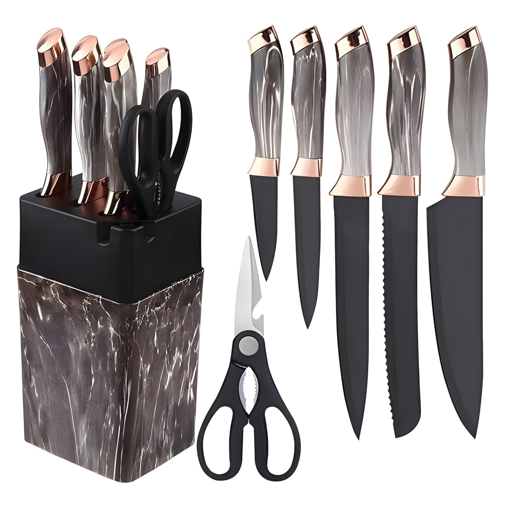Imagine a functional kitchen knife set that elevates your kitchen's style. Our chef knife set boasts a stunning design, featuring high-quality stainless-steel blades with a unique marble handle that is both eye-catching and ergonomic. Choose between three luxurious color options: Black with Bronze accents, White with Bronze accents, or a Mixed Black and Bronze finish. No matter your choice, this knife set for the kitchen will instantly transform your kitchen into a space where performance meets artistry.