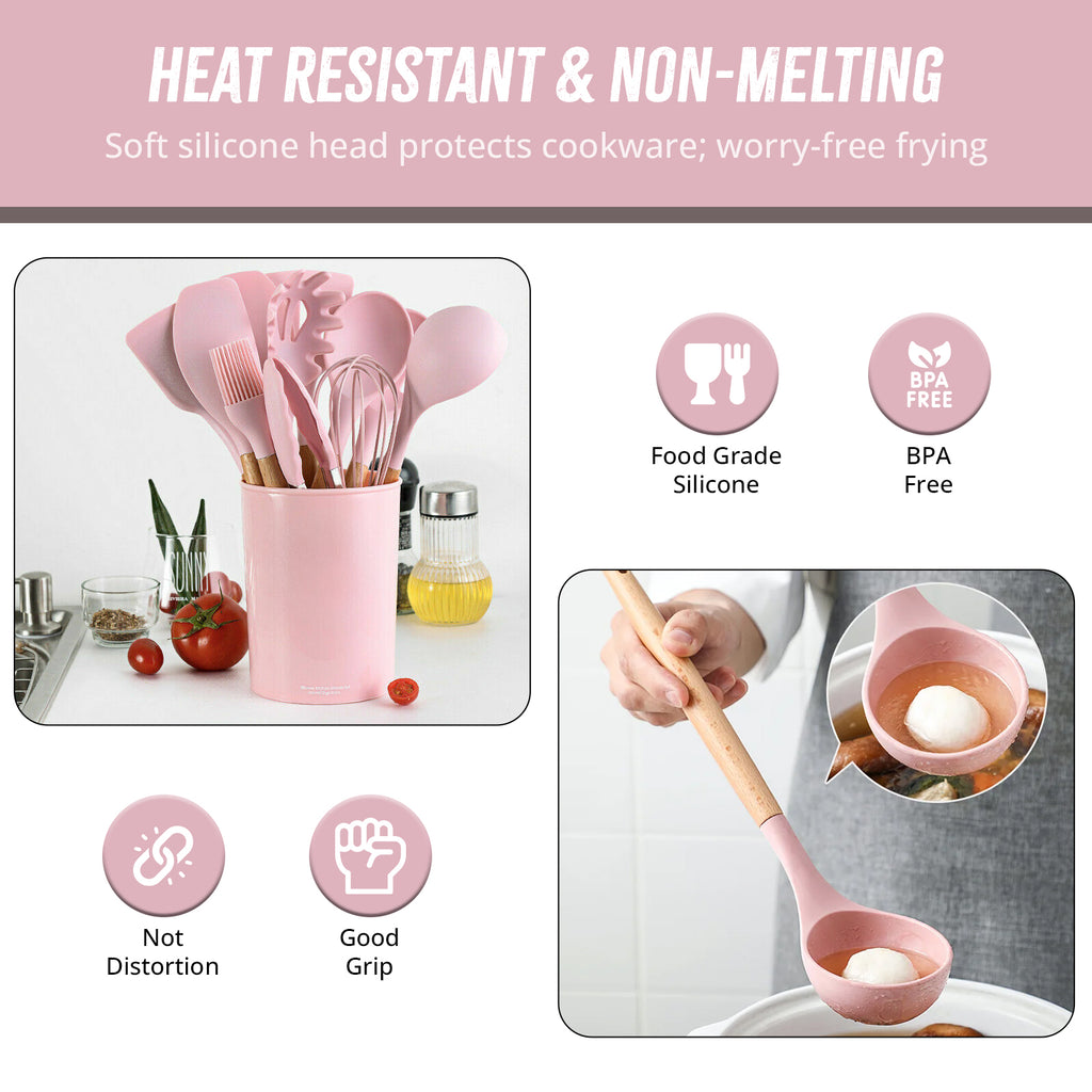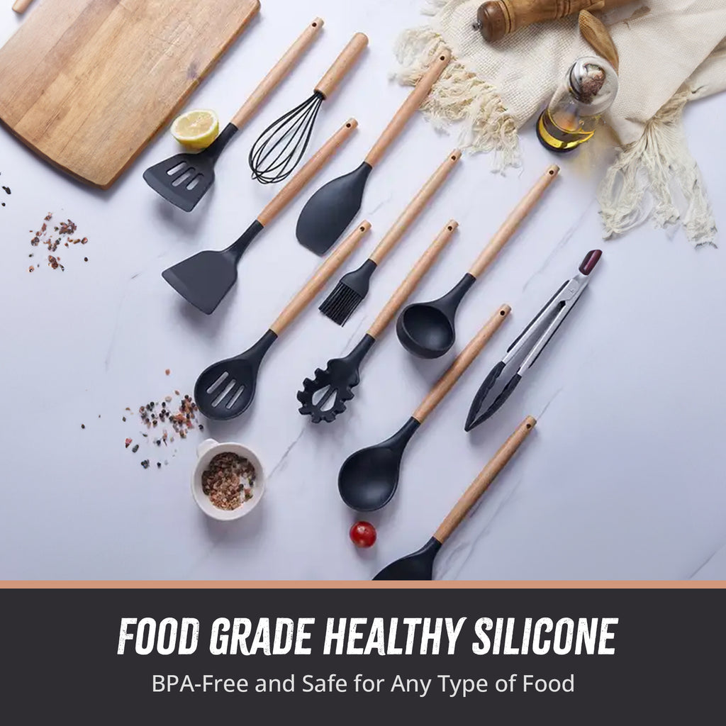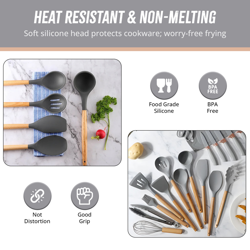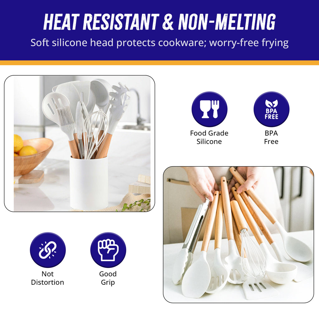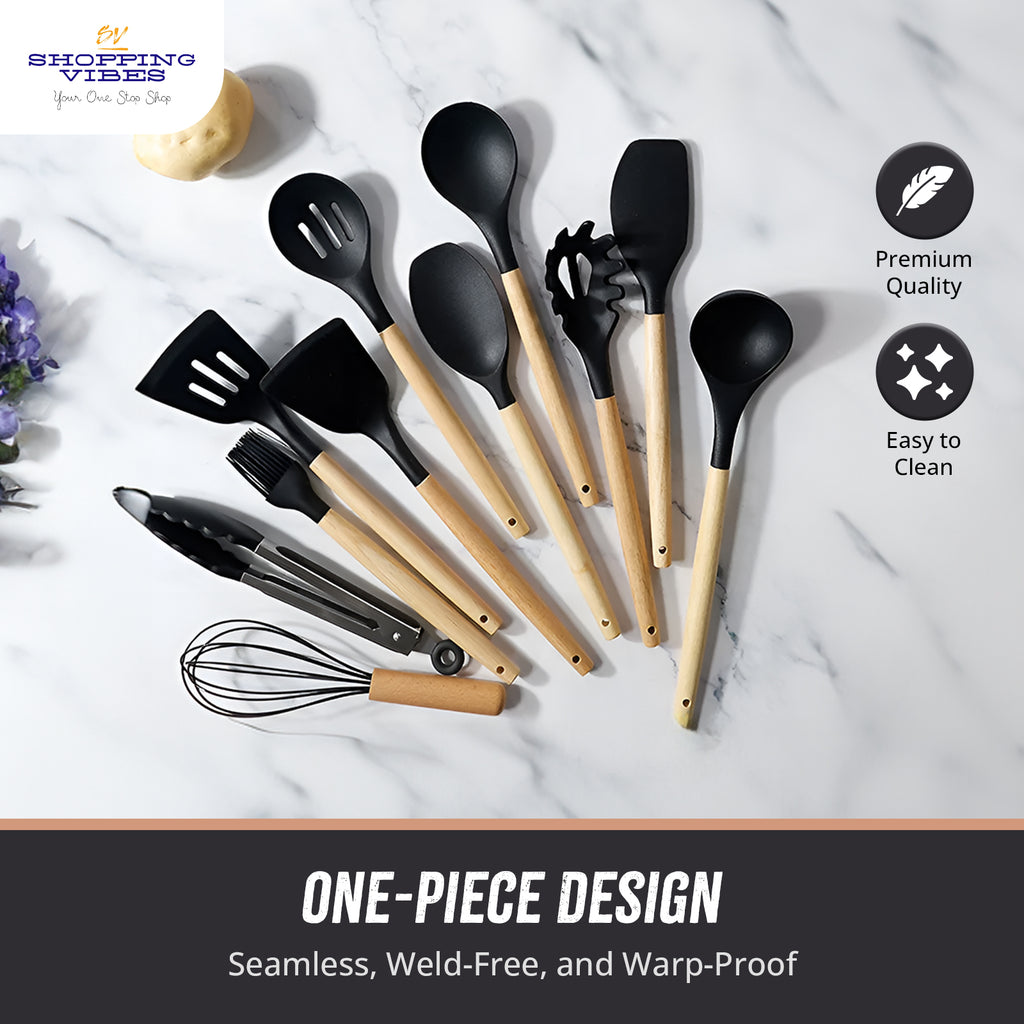 - Premium 12-piece kitchen utensils set with durable silicone heads & bamboo wood handles.
